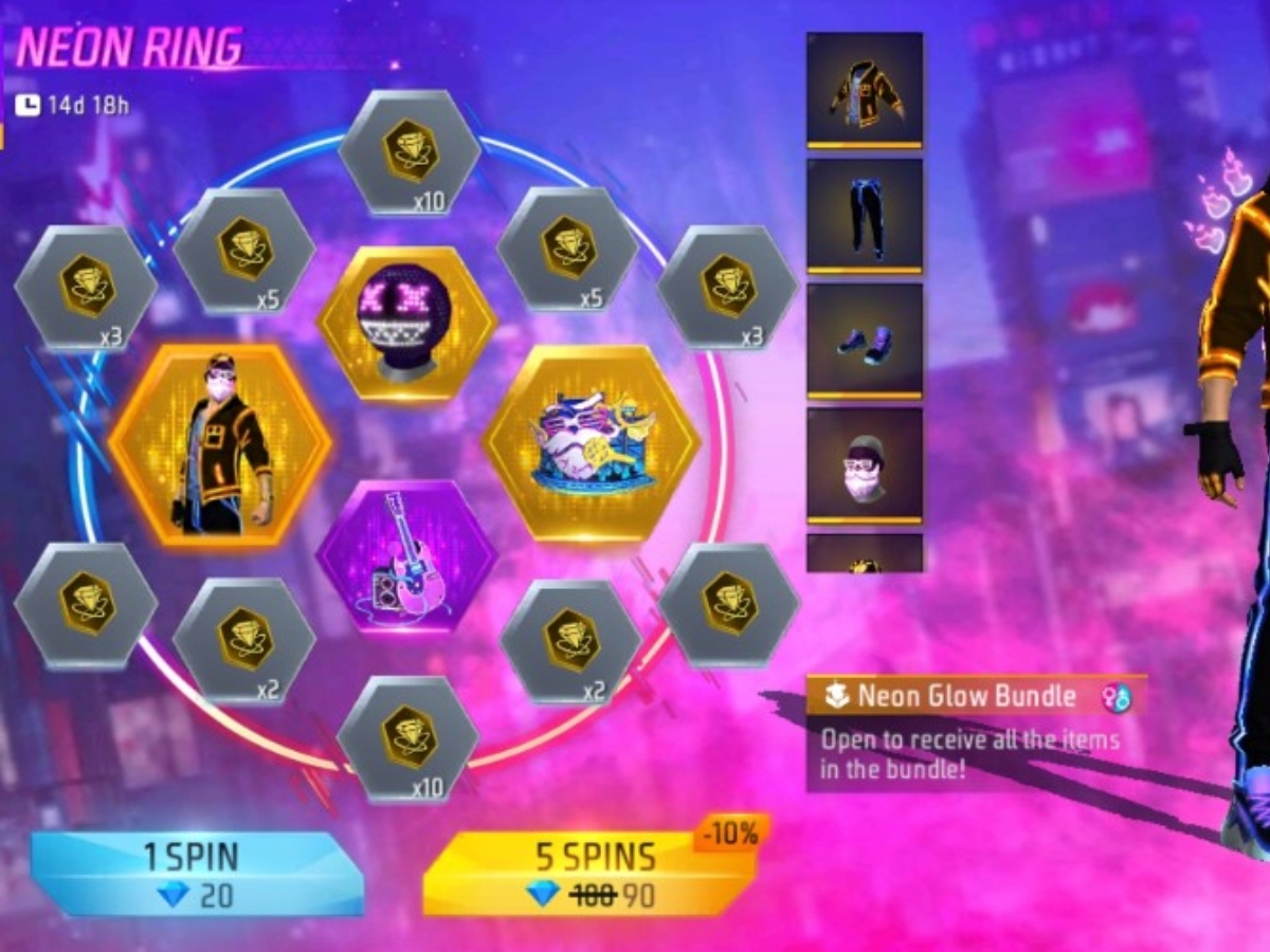 Free Fire Max Neon Ring इवेंट आज से शुरू हुआ है, जो अगले 14 दिन तक जारी रहेगा। इस दौरान स्पिन करके Neon Glow बंडल और Gloo Wall - Neon Party स्किन को प्राप्त किया जा सकेगा। इतना ही नहीं इवेंट से गेमर्स Disco Ball Mask और Universal Ring Token को भी क्लेम कर सकेंगे।