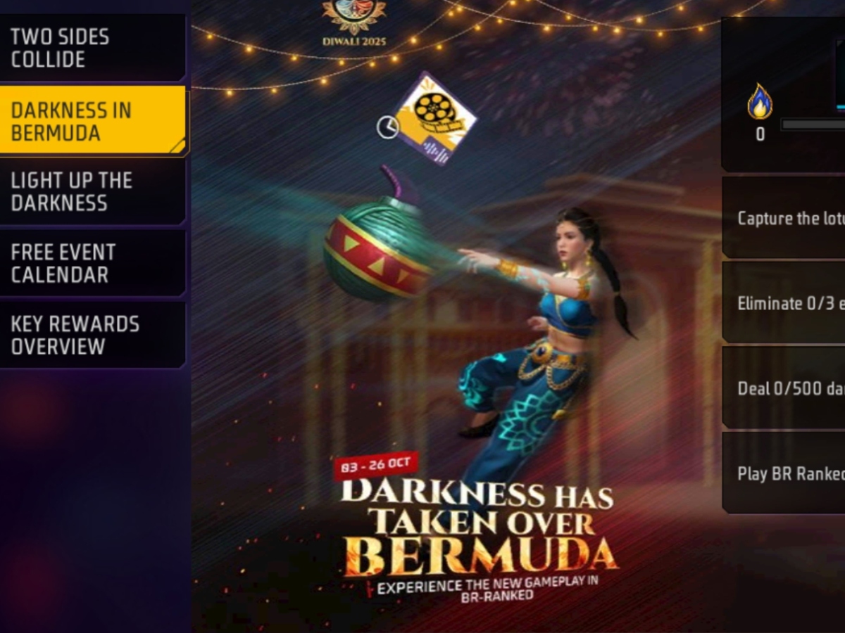 Free Fire Max में Darkness in Bermuda इवेंट चल रहा है। इसमें गोल्ड रॉयल वाउचर और Bhai ne bola karne ka to karne ka का वॉइस पैक दिया जा रहा है। इसके अलावा, स्पेशल दिवाली ग्रेनेड भी मिल रहा है।