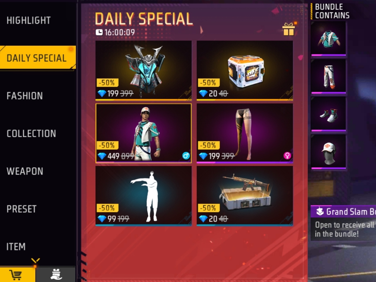 Free Fire Max में आज Grand Slam बंडल और Shuffling इमोट मिल रहा है। इन दोनों आइटम को आधी कीमत में खरीदा जा सकता है। ये दोनों Daily Special का हिस्सा हैं।