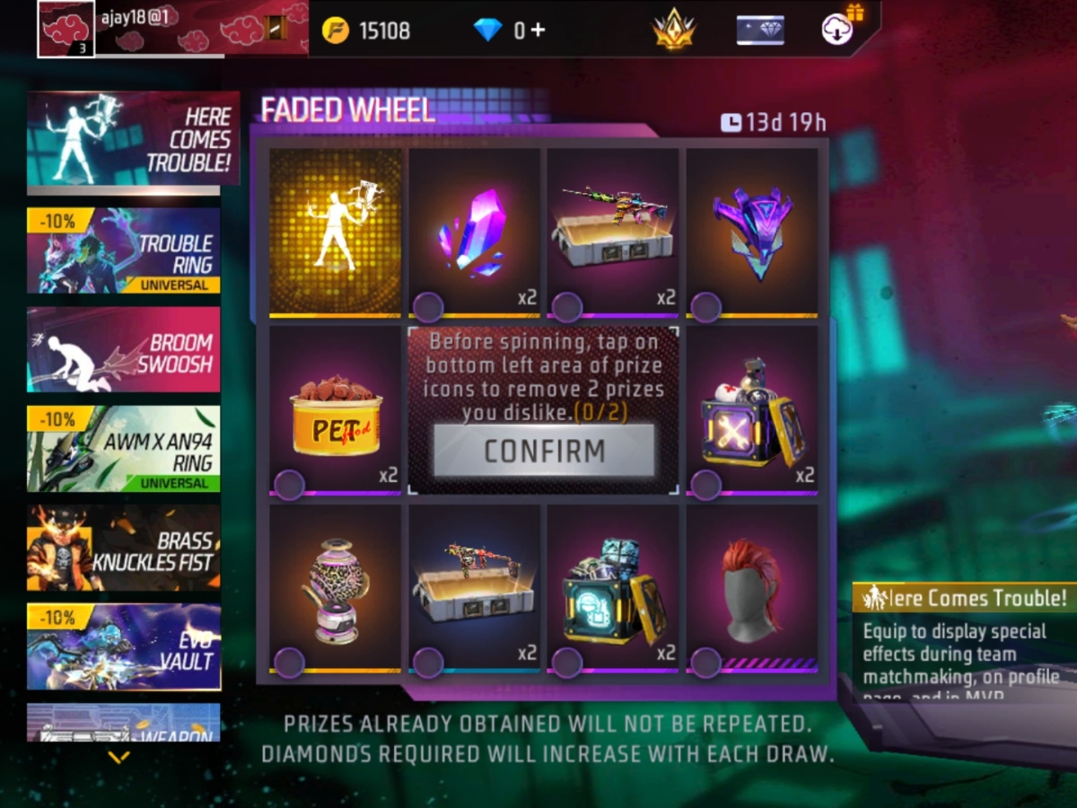 फेडेड व्हील इवेंट से रिवॉर्ड पाने के लिए आपको स्पिन करना होगा, लेकिन उससे पहले आपको रिवॉर्ड लिस्ट उन दो आइटम को सबसे पहले चुनना होगा, जिन्हें आप अनलॉक नहीं करना चाहते हैं। इसके बाद वो आइटम रिमूव हो जाएंगे और रिवॉर्ड लिस्ट रिफ्रेश हो जाएगी। साथ ही, स्पिन बटन भी एक्टिव हो जाएगा, जिसके लिए आपको 9 डायमंड खर्च करने होंगे।