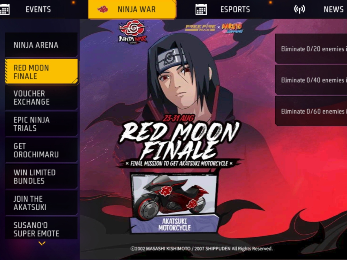 Free Fire Max में Naruto के आने से गेम काफी बदल गया है। इसमें नारूतो और उससे जुड़े आइटम देखने को मिले हैं। इसके साथ एनेमे से इंस्पायर्ड गेमिंग इवेंट भी लाइव किए गए हैं। इनमें प्रीमियम वाउचर, वेपन स्किन, इमोट और बंडल जैसे आइटम ईनाम के तौर पर दिए जा रहे हैं। इनमें एक Red Moon Finale इवेंट है। इसमें लक रॉयल वाउचर और वेपन स्किन मिल रही है। यही नहीं व्हीकल स्किन भी रिवॉर्ड के तौर पर दी जा रही है।
