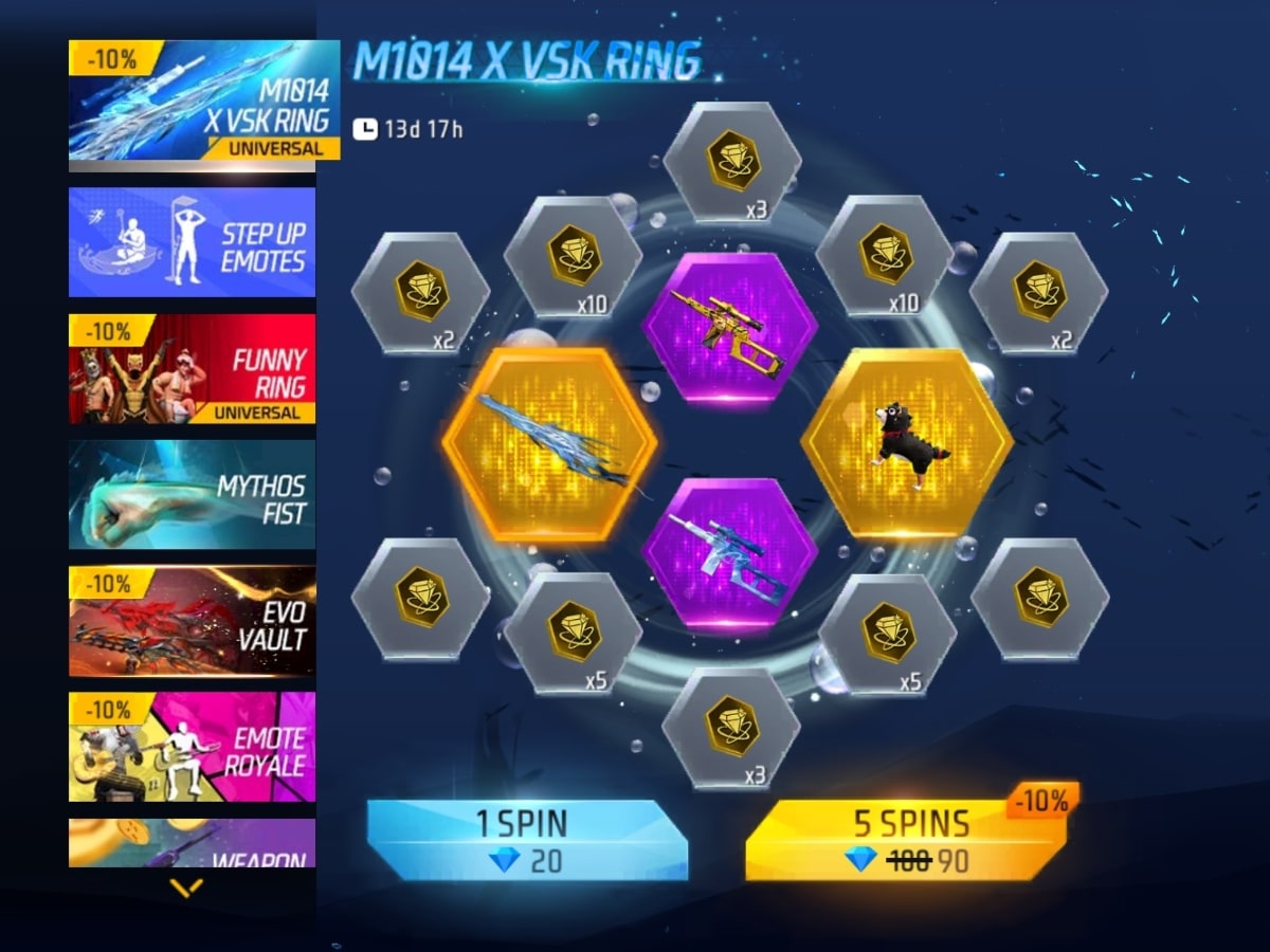 इस गेमिंग इवेंट में मिल रही वेपन स्किन्स को पाने के लिए डायमंड का इस्तेमाल करना होगा। इसमें एक बार स्पिन करने के लिए 20 डायमंड और पांच बार स्पिन करने के लिए 100 डायमंड की बजाय 90 डायमंड का उपयोग करना होगा।