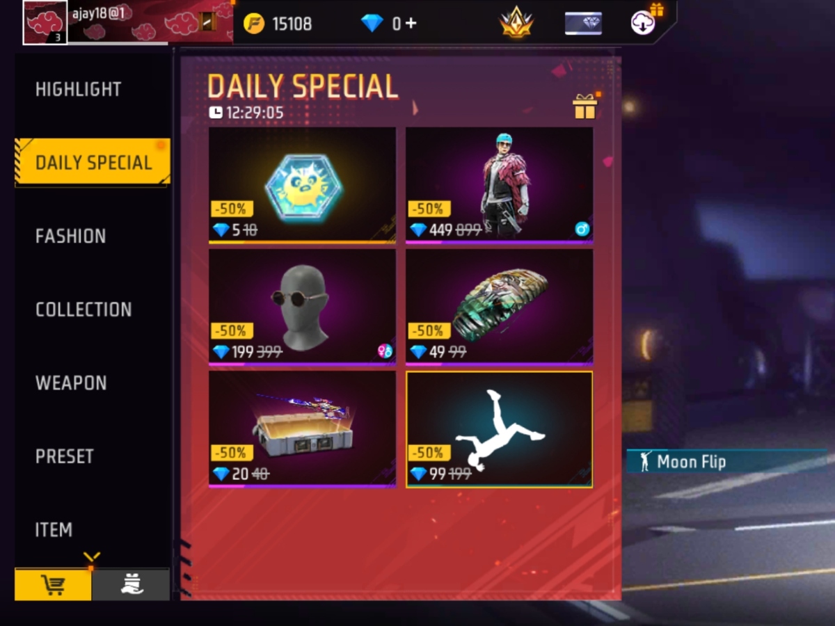 - Moon Flip इमोट को 199 डायमंड की जगह 99 डायमंड में अनलॉक किया जा सकता है।