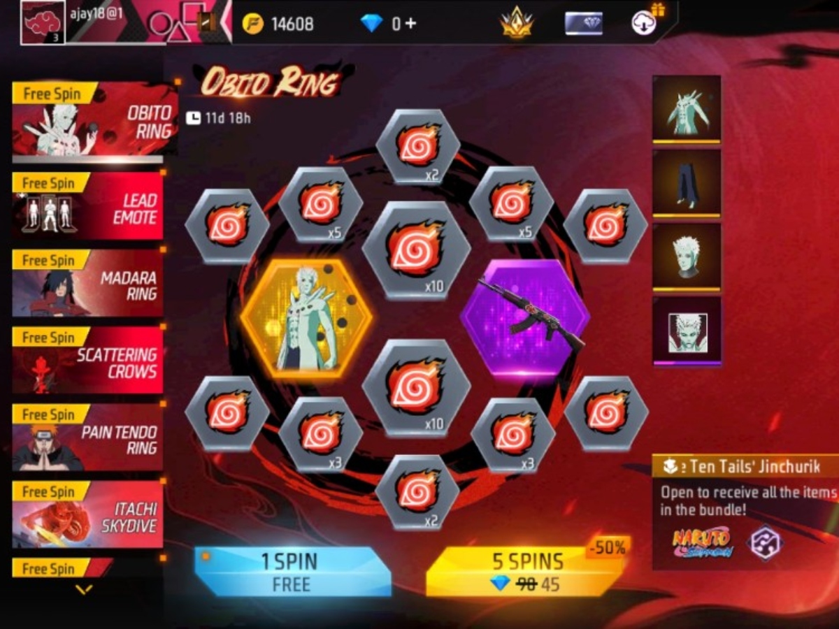 फ्री फायर मैक्स का OBITO Ring लक रॉयल इवेंट है। इसका मतलब है कि इस इवेंट में मिलने वाले आइटम को स्पिन करके प्राप्त किया जा सकता है। इसके लिए आपको डायमंड खर्च करने पड़ेंगे। हालांकि, अच्छी बात यह है कि इसमें पहला स्पिन फ्री है। इससे पहली बार में रिवॉर्ड्स को बिना डायमंड के जीता जा सकता है।