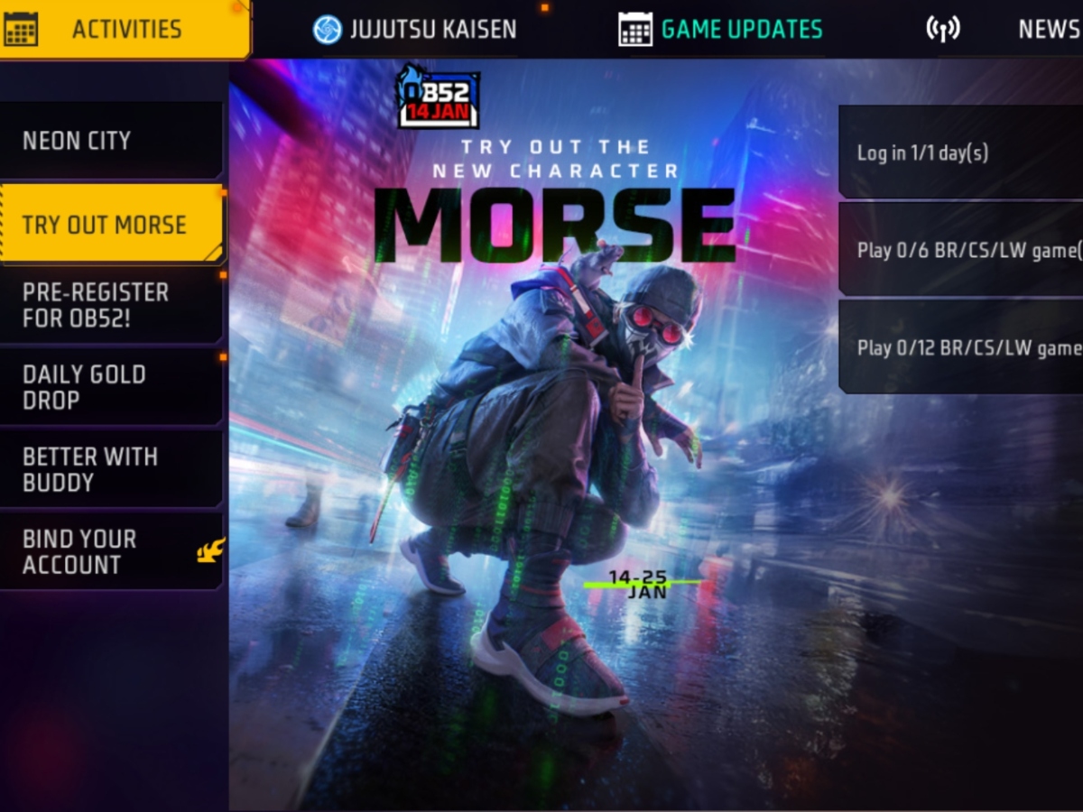 Free Fire Max में एक्टिव Try Out Morse एक टास्क बेस्ड इवेंट है। इसका मतलब है कि इस इवेंट में मिलने वाले ईनाम को टास्क पूरा करके पाया जा सकता है। यह गेमिंग इवेंट गेमर्स के लिए 25 जनवरी 2026 तक लाइव रहेगा।