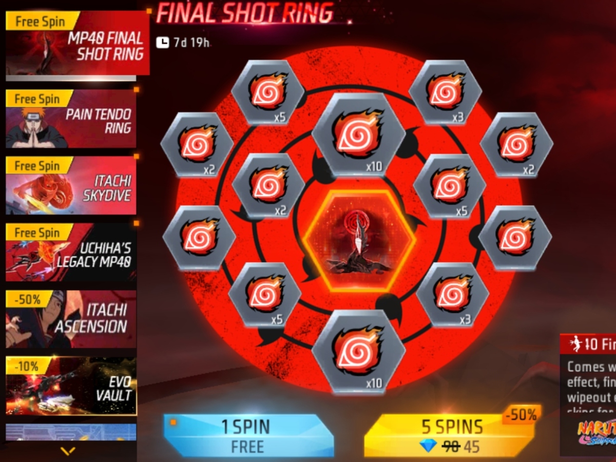 फ्री फायर मैक्स का यह खास इवेंट आज गेमर्स के लिए लाइव हुआ है। यह अगले 7 दिन तक जारी रहेगा। इस बीच स्पिन करके मुफ्त में MP-40 Final Sot-Infinite Tsukuyomi स्पेशल स्काई इफेक्ट को क्लेम किया जा सकता है। इसके अलावा, Naruto Universal Token को भी पाया जा सकता है। इन दोनों आइटम के लिए स्पिन करना होगा।