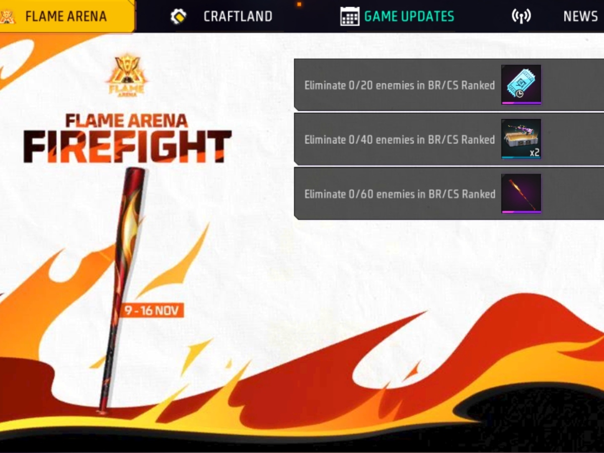 - BR/CS रैंक्ड मैच में 60 दुश्मनों को नॉक आउट करने पर फ्लेम एरिना बैट मिलेगा।