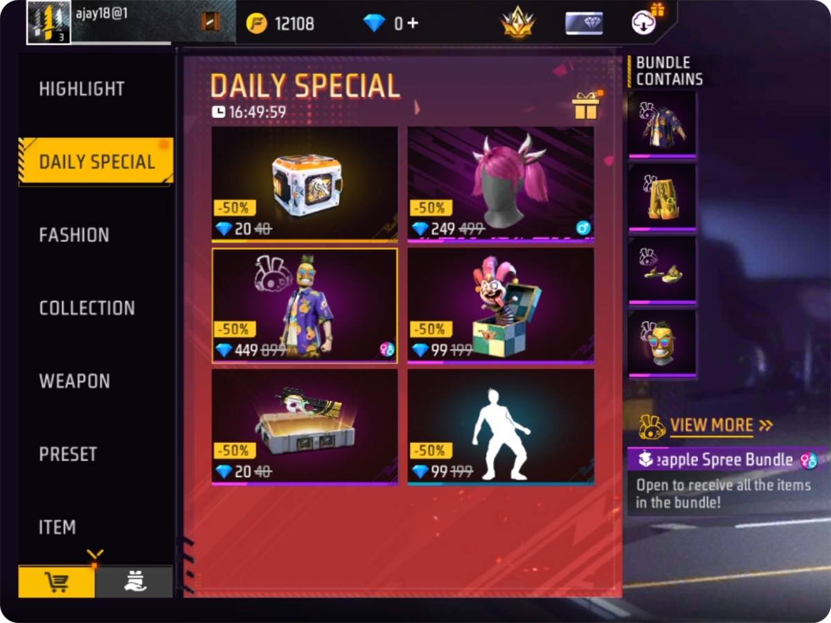 Free Fire Max का Daily Special रीफ्रेश हो गया है। इस स्पेशल सेक्शन में Pineapple Spree बंडल और Shinny इमोट आधे दाम में मिल रहे हैं, जिन्हें खरीदने का अभी बहुत बढ़िया मौका है।