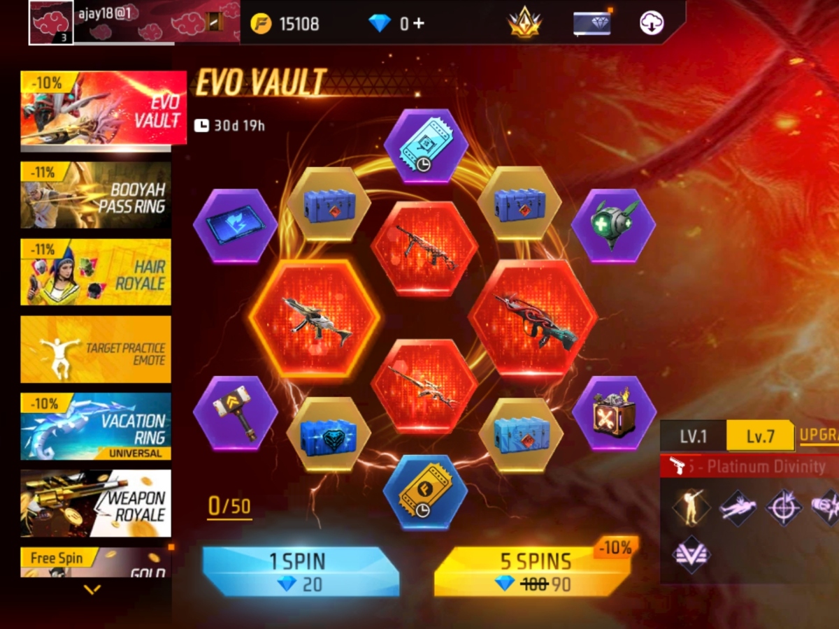 फ्री फायर मैक्स के इवेंट में स्पिन करके रिवॉर्ड अनलॉक किए जा सकते हैं। इसमें स्पिन करने के लिए डायमंड खर्च करने पड़ते हैं। इवो वॉल्ट में 1 बार स्पिन करने के लिए 20 डायमंड इस्तेमाल करने होंगे। वहीं, 5 बार स्पिन करने के लिए 90 डायमंड लगेंगे।