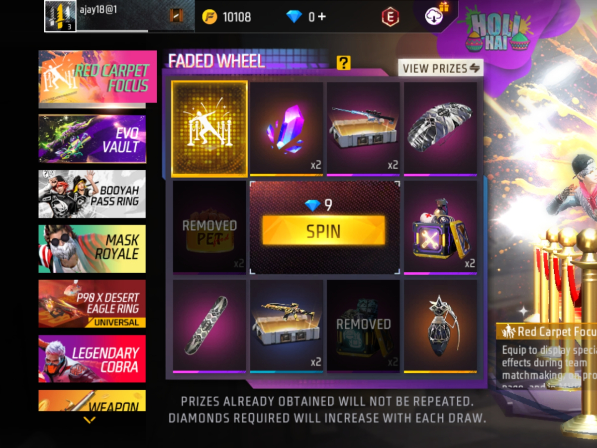 अब आपको स्क्रीन पर स्पिन बटन दिखाई देगा। उस पर क्लिक करके स्पिन किया जा सकेगा। इसके लिए 9 डायमंड खर्च करने पड़ेंगे। आपकी जानकारी के लिए बता दें कि हर स्पिन के बाद डायमंड की संख्या बढ़ जाएगी। इवेंट में एक बार जो आइटम मिल गया, वो दोबारा नहीं मिलेगा।