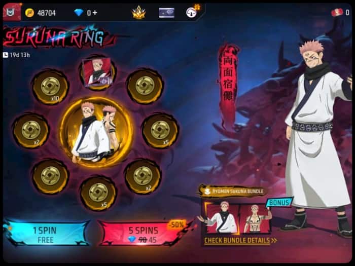 Sukuna Ring इवेंट में 1 स्पिन बिल्कुल फ्री है। वहीं, 5 स्पिन के लिए आपको 90 की जगह सिर्फ 45 डायमंड्स ही खर्च करने होंगे। और पढें: Free Fire Max Daily Special: गेमर्स के लिए अपडेट हुआ खास स्टोर, आधे दाम में मिल रहा Cutthroat Candy बंडल