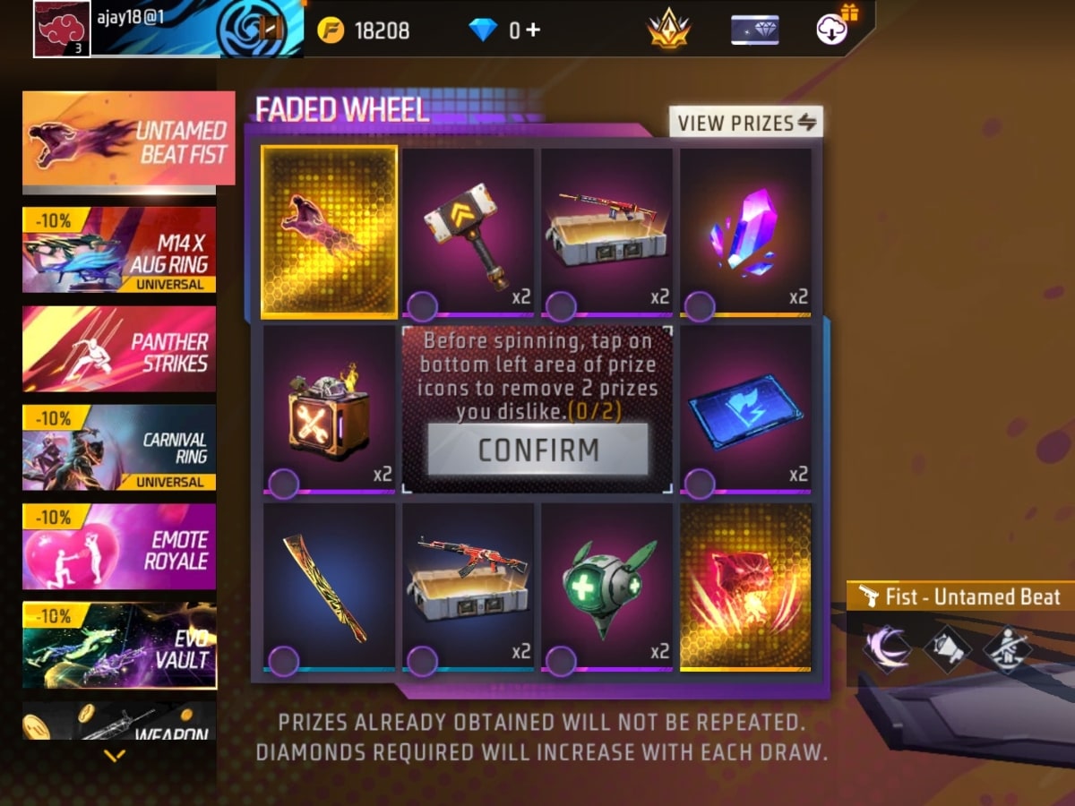 Free Fire Max का अनटेम्ड बीट फिस्ट एक Faded Wheel इवेंट है। इस खास गेमिंग इवेंट को आज लाइव किया गया है। इसमें Fist-Untamed Fist, Enhance Hammer और Super Leg Pocket मिल रही है। इन सब के साथ Parang-Booyah Slasher जैसे आइटम को भी प्राप्त किया जा सकता है। और पढें: Free Fire Max में लाइव हुआ Holi इवेंट, शानदार Voice Pack और Gold Royale वाउचर मिल रहा फ्री