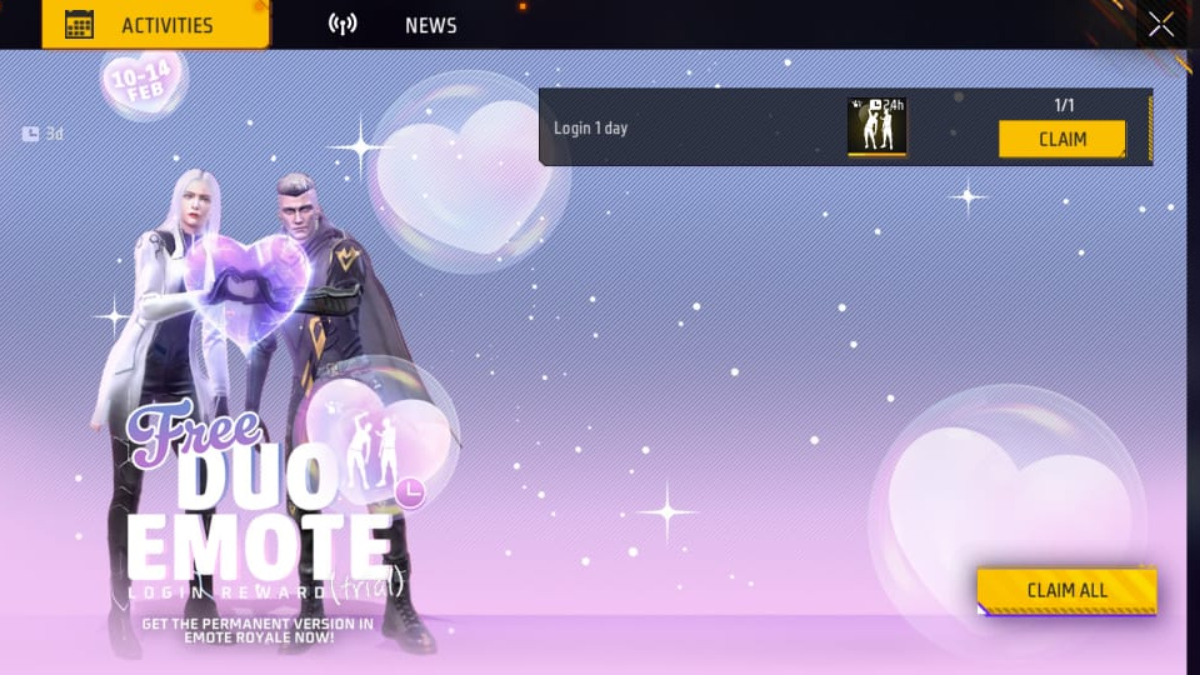 Free Fire MAX में वैलेंटाइन डे (Valentine Day 2024) को ध्यान में रखकर नया इमोट इवेंट जोड़ा गया है। इसका नाम 'Duo Emote' है। इसमें प्लेयर्स को रोमांटिक इमोट्स और कॉस्मेटिक आइटम्स प्राप्त करने का मौका मिलेगा। इसके अलावा पेट डॉग्स, लूट क्रेट्स और बैकपैक स्किन जैसे आइटम्स भी मिलेंगे। गेम डेवलपर Garena का मानना है कि इमोट्स से गेम मजेदार बनता है और प्लेयर्स को बेहतर गेमिंग एक्सपीरियंस मिलता है। चलिए नीचे खबर में जानते हैं इमोट्स पाने का तरीका...