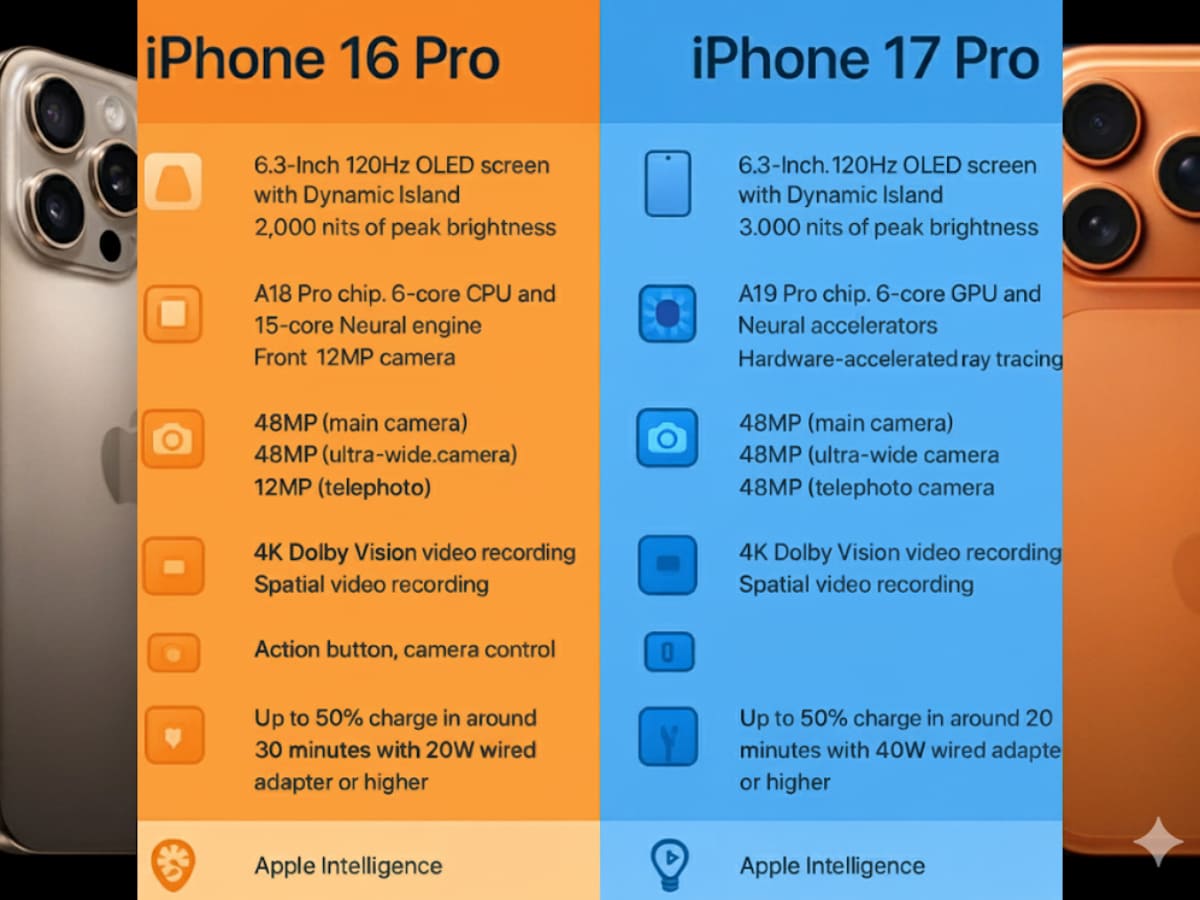 iPhone 16 Pro में A18 Pro चिप दी गई है, जिसमें 6-Core CPU, GPU और 16-Core Neural Engine है। iPhone 17 Pro में A19 Pro चिप है, जिसमें 6-Core GPU, Neural accelerators और hardware-accelerated ray tracing जैसी एडवांस टेक्नोलॉजी है। यानी iPhone 17 Pro गेमिंग एक्सपीरियंस और ग्राफिक्स और बेहतर होंगे।