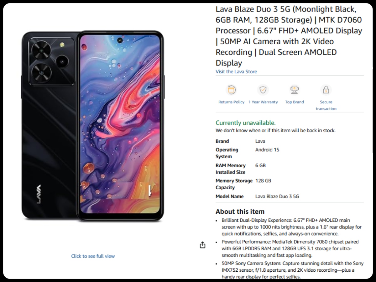 Lava Blaze Duo 3 फोन जल्द ही भारत में डुअल डिस्प्ल के साथ लॉन्च होने वाला है। यह फोन सभी फीचर्स के साथ Amazon पर स्पॉट किया गया है। यहां जानें डिटेल्स।