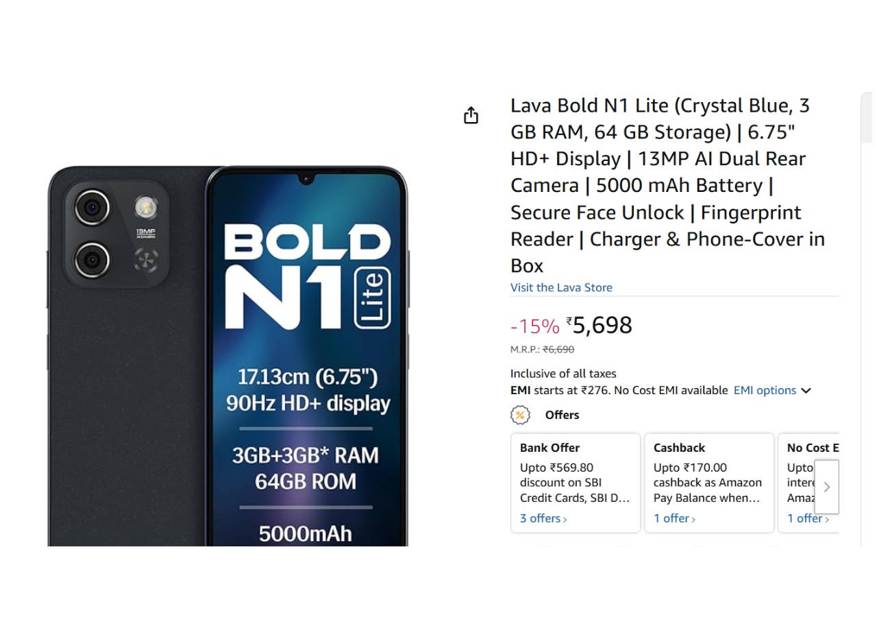 Amazon लिस्टिंग के जरिए Lava Bold N1 Lite की कीमत भी लॉन्च से पहले कंफर्म हो गई है। कंपनी ने फोन को 6,690 रुपये की कीमत में पेश किया है। हालांकि, अमेजन से इसे 5,698 रुपये में खरीद सकते हैं। फोन में Crystal Blue और Crystal Gold कलर ऑप्शन मिलते हैं।