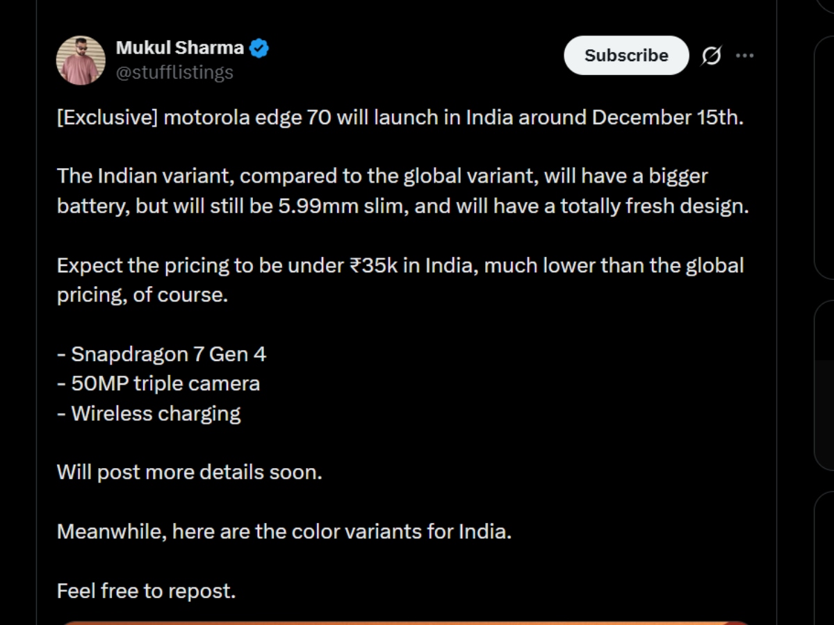 मुकुल की मानें, तो Motorola Edge 70 स्मार्टफोन को भारत में क्वालकॉम के Snapdragon 7 Gen 4 प्रोसेसर के साथ पेश किया जा सकता है। इस डिवाइस में 50MP का ट्रिपल रियर कैमरा सेटअप और वायरलेस चार्जिंग का सपोर्ट मिलेगा।