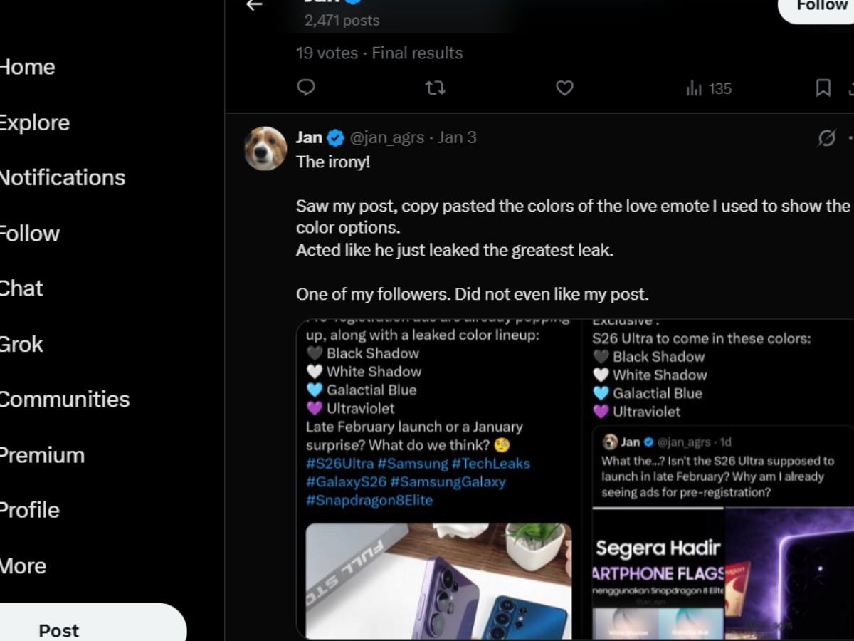 हाल ही में 'X' पर एक यूर @jan_agrs ने कुछ स्क्रीनशॉट शेयर किए हैं, जिन्हें Samsung Galaxy S26 Ultra का शुरुआती टीजर बताया जा रहा है, कहा जा रहा है कि यह टीजर इंडोनेशिया के Instagram पर थोड़ी देर के लिए दिखा था। इस टीजर में फोन के Snapdragon 8 Gen 5 Elite चिपसेट और चार संभावित कलर ऑप्शन दिखाई दिए। हालांकि यह लीक पूरी तरह कन्फर्म नहीं है और यह भी संभव है कि यह फेक हो या गलती से पोस्ट किया गया हो क्योंकि किसी और ने इसकी पुष्टि नहीं की है।