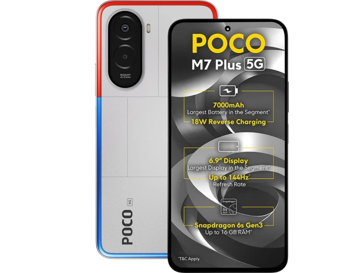Poco M7 Plus 5G उन लोगों के लिए अच्छा फोन है जो कम बजट में बड़ी बैटरी चाहते हैं। इसमें 7000mAh की बैटरी मिलती है, जो एक बार चार्ज करने पर आसानी से पूरा दिन या उससे ज्यादा चल जाती है। फोन में 33W फास्ट चार्जिंग और 18W रिवर्स चार्जिंग का सपोर्ट है। इसमें बड़ा 6.9-इंच का 144Hz डिस्प्ले है, जो वीडियो और गेमिंग के लिए स्मूथ अनुभव देता है। रोजमर्रा के काम, सोशल मीडिया और हल्की गेमिंग के लिए यह फोन बढ़िया ऑप्शन है। Flipkart पर इसकी कीमत ₹12,999 है।