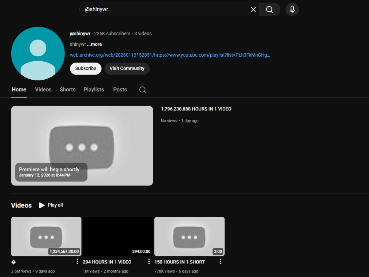 जब कोई यूजर इस वीडियो पर क्लिक करता है तो एक और हैरानी सामने आती है। शुरुआत में 140 साल का रनटाइम दिखता है लेकिन जैसे ही वीडियो प्ले होता है, इसकी लंबाई अचानक 12 घंटे हो जाती है। इससे यह सवाल उठने लगे कि क्या वाकई YouTube पर इतना लंबा वीडियो अपलोड करना संभव है? YouTube की गाइडलाइंस के मुताबिक, वेरिफाइड अकाउंट भी अधिकतम 12 घंटे का ही वीडियो अपलोड कर सकते हैं। दिलचस्प बात यह है कि इसी @ShinyWR चैनल पर 294 घंटे और 300 घंटे के दूसरे वीडियो भी मौजूद हैं। इन वीडियो में भी कोई कंटेंट नहीं है, सिर्फ ब्लैक स्क्रीन है।