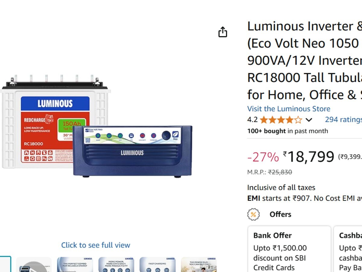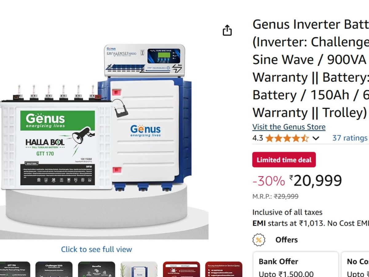इस कॉम्बो में 900VA इन्वर्टर और 200Ah की बैटरी के साथ एक मजबूत ट्रॉली भी है। इसमें ओवरलोड प्रोटेक्शन और लॉन्ग बैकअप दिया गया है। बैटरी की 72 महीने की लंबी वारंटी (42 फुल + 30 प्रो-राटा) इसे खास बनाती है। Amazon Sale में यह एक बेहतरीन ऑफर है।