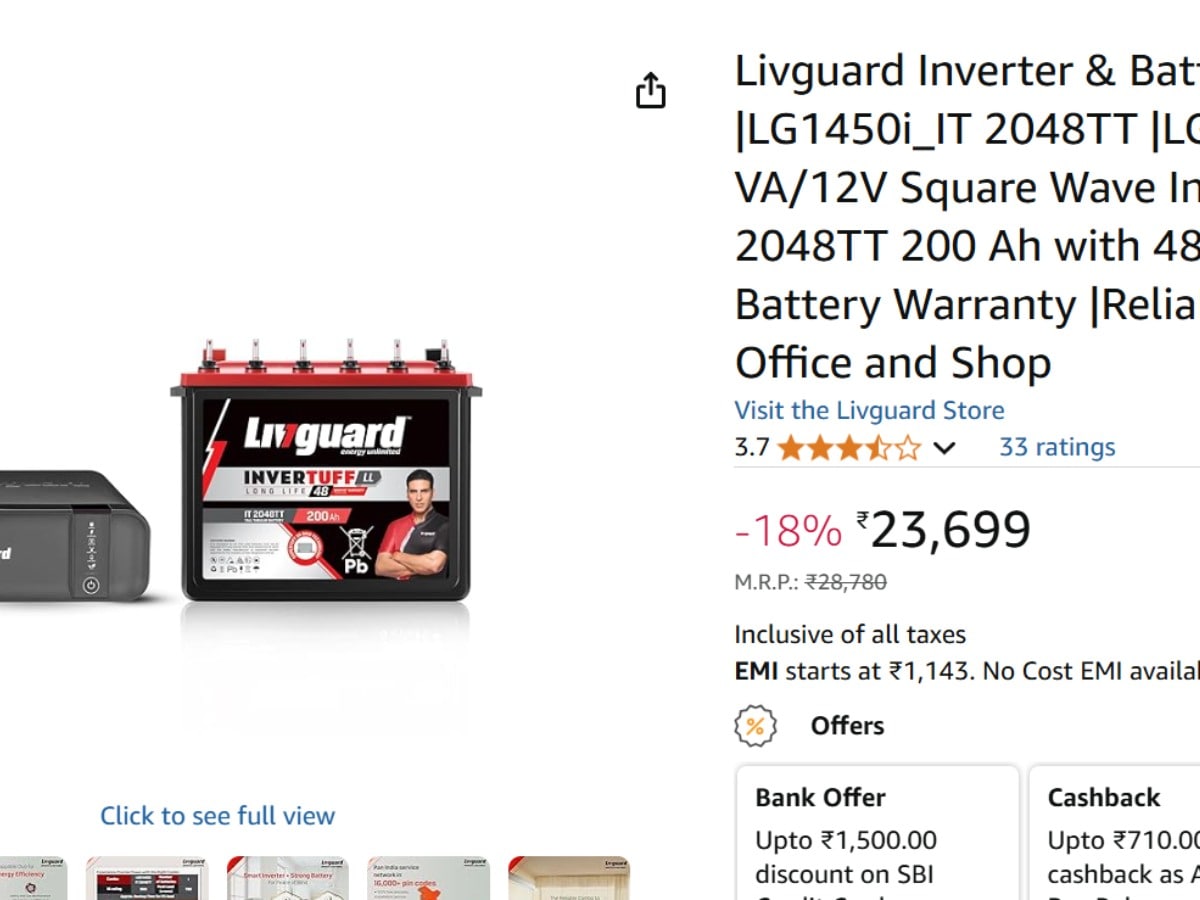 यह कॉम्वो 900VA के शुद्ध साइन वेव इन्वर्टर और 220Ah की बड़ी बैटरी के साथ आता है, जो लंबे समय तक बिजली बैकअप देता है। घर, दुकान या ऑफिस सभी के लिए सही है। इसमें ओवरलोड और शॉर्ट सर्किट से सुरक्षा भी है। बैटरी की की 48 महीने की और इन्वर्टर की 3 साल की वारंटी है, जो इसे भरोसेमंद बनाती है। Amazon Sale में ये शानदार डील है।