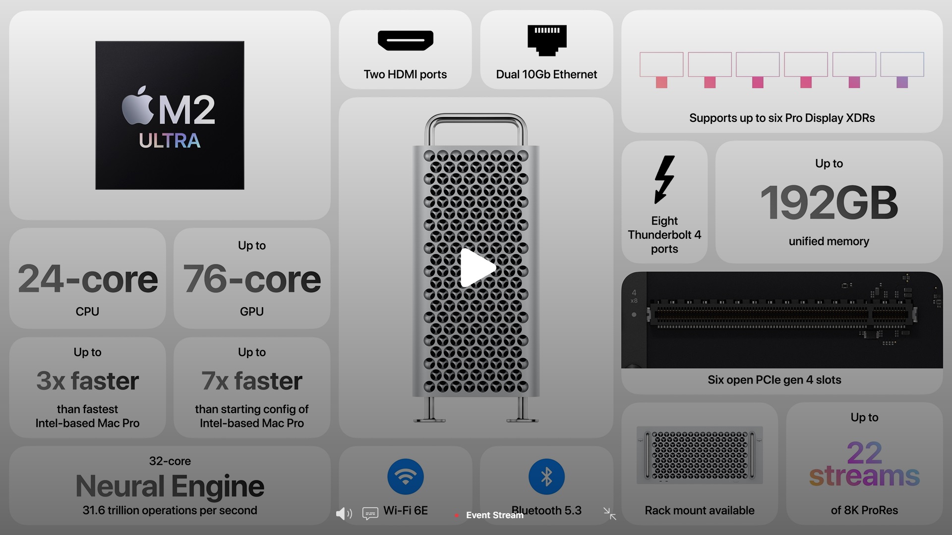 एप्पल के इस नए डिवाइस में M2 Ultra चिपसेट मिलता है, जो 192GB तक मेमोरी और 800GB/s तक की यूनिफाइड मेमोरी बैंडविथ को सपोर्ट करता है। इसमें 24 4K कैमरा फीड को एक साथ ओपन किया जा सकता है। इसमें 6 ओपन एक्सपेंशन स्लॉट मिलता है। इसके अलावा यह प्रो रेजलूशन वाला वीडियो स्ट्रीम कर सकता है।