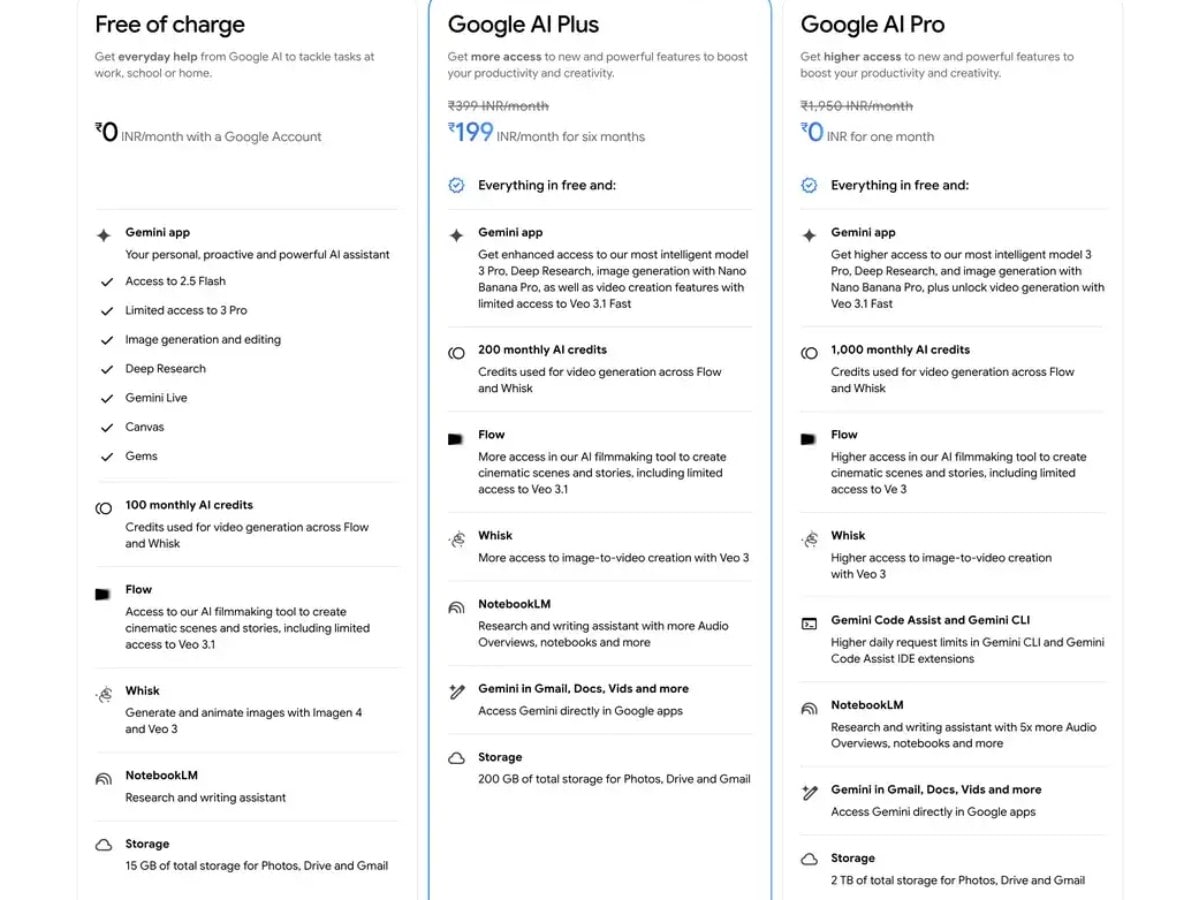 भारत में Google AI Plus Plan की कीमत 399 रुपये प्रति माह रखी गई है लेकिन शुरुआत के ऑफर में इसे छह महीने के लिए केवल 199 रुपये में लिया जा सकता है, जो कि यूजर्स के लिए बहुत ही शानदार डील है। इस प्लान में फ्री टियर की सभी सुविधाओं के साथ-साथ अतिरिक्त लाभ भी शामिल हैं। यूजर्स को Gemini 3 Pro तक बेहतर पहुंच मिलेगी, इसके अलावा Deep Research और Nano Banana Pro के साथ इमेज जनरेशन का भी ऑप्शन मिलेगा। साथ ही वीडियो जनरेशन के लिए प्रति माह 200 AI क्रेडिट्स दिए जाएंगे। और पढें: Google Gemini 3 हुआ फ्री, Jio यूजर्स को मिला बड़ा तोहफा, ऐसे करें क्लेम