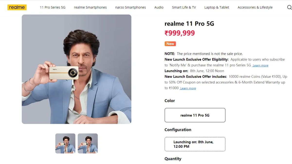 कंपनी ने हाल ही में Realme 11 Pro सीरीज की भारत लॉन्च डेट कंफर्म की थी। यह सीरीज भारत में 8 जून को लॉन्च होगी। लॉन्च से चंद दिन पहले अब कंपनी ने Realme 11 Pro 5G स्मार्टफोन की कीमत भारतीय साइट पर लाइव कर दी है। जी हां, आज सोमवार को यह लिस्टिंग लाइव कर दी गई है। लिस्टिंग की मानें, तो रियलमी 11 प्रो 5जी फोन की कीमत भारत में 999,999 रुपये होगी।