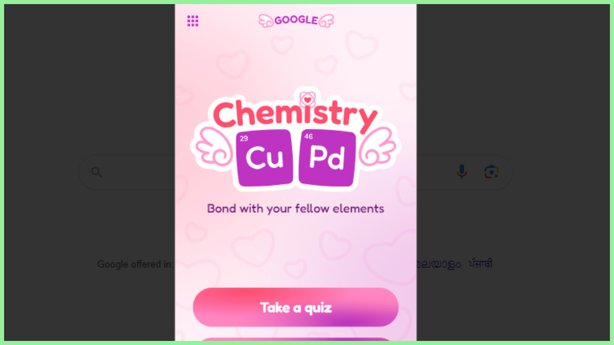 गूगल के नए वैलेंटाइन डूडल पर क्लिक करने पर क्विज ओपन होगा। यहां से आप अपने केमिकल कंपाउंड के बारे में जान सकेंगे। इसके अलावा खुद का केमिकल कंपाउंड चुनकर आप यह भी जान पाएंगे कि किस केमिकल के साथ आपका बॉन्ड अच्छा होगा।