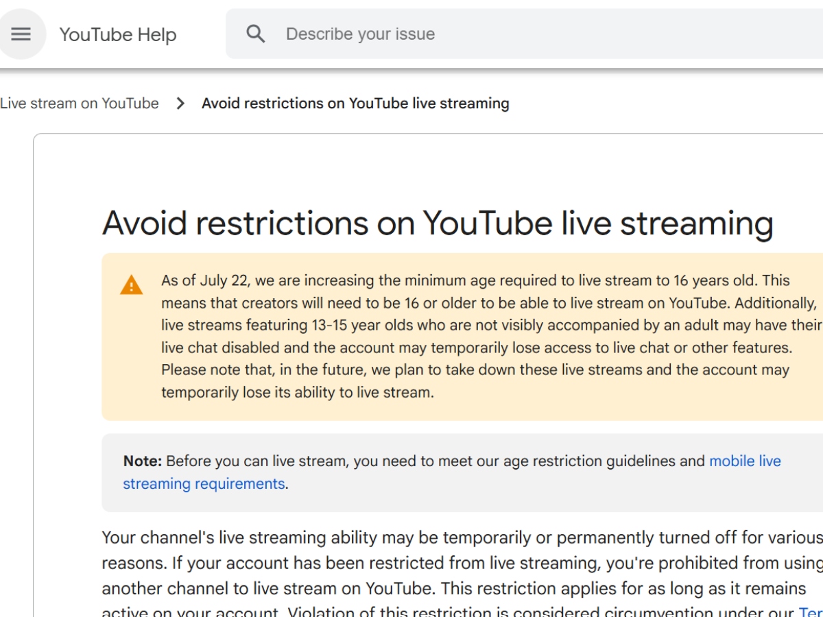 Google ने अपने सपोर्ट पेज पर नई पॉलिसी की जानकारी की है। सपोर्ट पेज के मुताबिक, 22 जुलाई से YouTube पर Live Stream करने की न्यूनतम उम्र 16 साल होगी। इस नए नियम के तहत YouTube पर लाइव करने वाले यूजर्स की उम्र 13 साल से बढ़ाकर 16 साल तक कर दी गई है। इसका मतलब यह है कि अब यूट्यूब पर Live करने के लिए आपकी उम्र कम से कम 16 साल होनी जरूरी है। की माने, तो यह नियम 22 जुलाई से लागू होने वाला है।