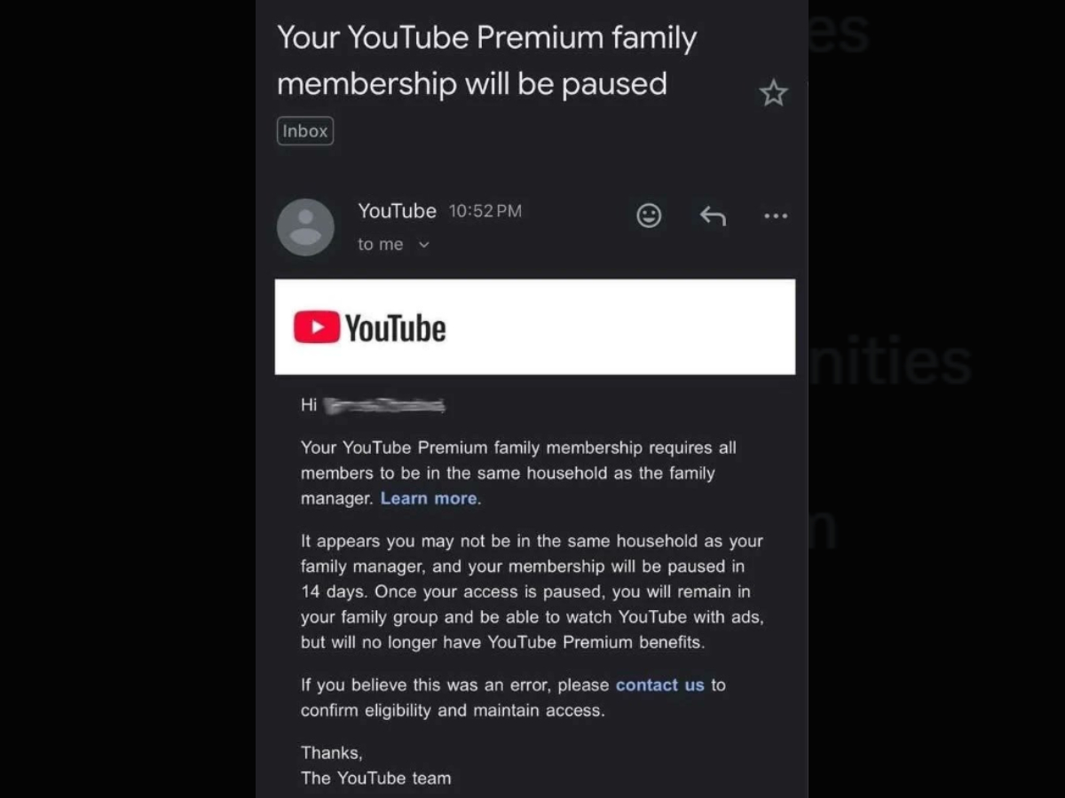 हालांकि नियम के अनुसार, इस फैमिली प्लान का लाभ केवल उन्हीं लोगों को मिलना चाहिए जो एक ही घर यानी एक ही पते पर रहते हैं, लेकिन अब तक यूट्यूब ने इस नियम को सख्ती से लागू नहीं किया था। अब खबर है कि कंपनी उन यूजर्स को ईमेल भेज रही है जो अलग-अलग जगह रहकर इस प्लान का फायदा उठा रहे हैं। ईमेल में साफ लिखा गया है कि अगर कोई सदस्य फैमिली मैनेजर के घर में नहीं रहता, तो उसका प्रीमियम एक्सेस 14 दिनों के अंदर रोक दिया जाएगा। इसके बाद यूजर अपने ग्रुप का हिस्सा तो रहेगा लेकिन उसे Youtube Ads के साथ ही देखना होगा।