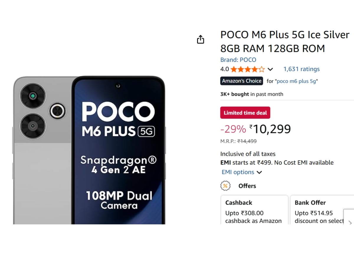POCO M6 Plus 5G के 8GB RAM + 128GB स्टोरेज वेरिएंट की कीमत Amazon पर 14,499 रुपये लिस्ट है। हालांकि, अभी इसे आप सस्ते में खरीद सकते हैं।