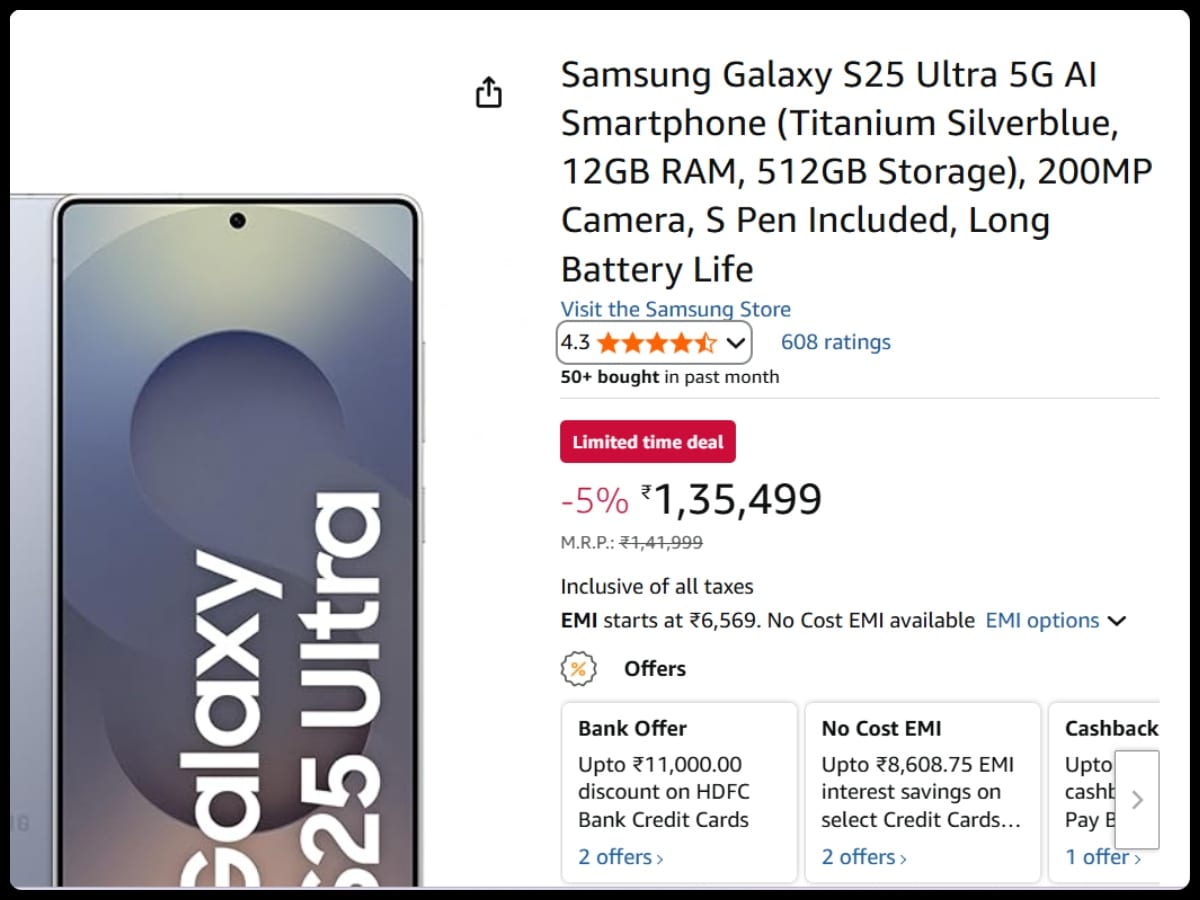 Samsung Galaxy S25 Ultra के डिस्काउंट की बात करें, तो अभी कंपनी फोन को अमेजन से 1,35,499 रुपये में खरीदा जा सकता है। साथ ही फोन पर HDFC बैंक कार्ड के जरिए 11,000 रुपये का ऑफ मिल रहा है।