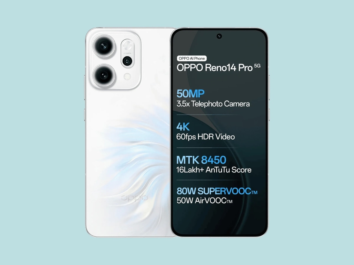 Oppo Reno14 Pro शॉपिंग वेबसाइट विजय सेल्स पर लिस्ट है। इस फोन के 256GB स्टोरेज वेरिएंट की कीमत 54,999 रुपये है। इसका 512GB स्टोरेज मॉडल 60,999 रुपये में मिल रहा है।