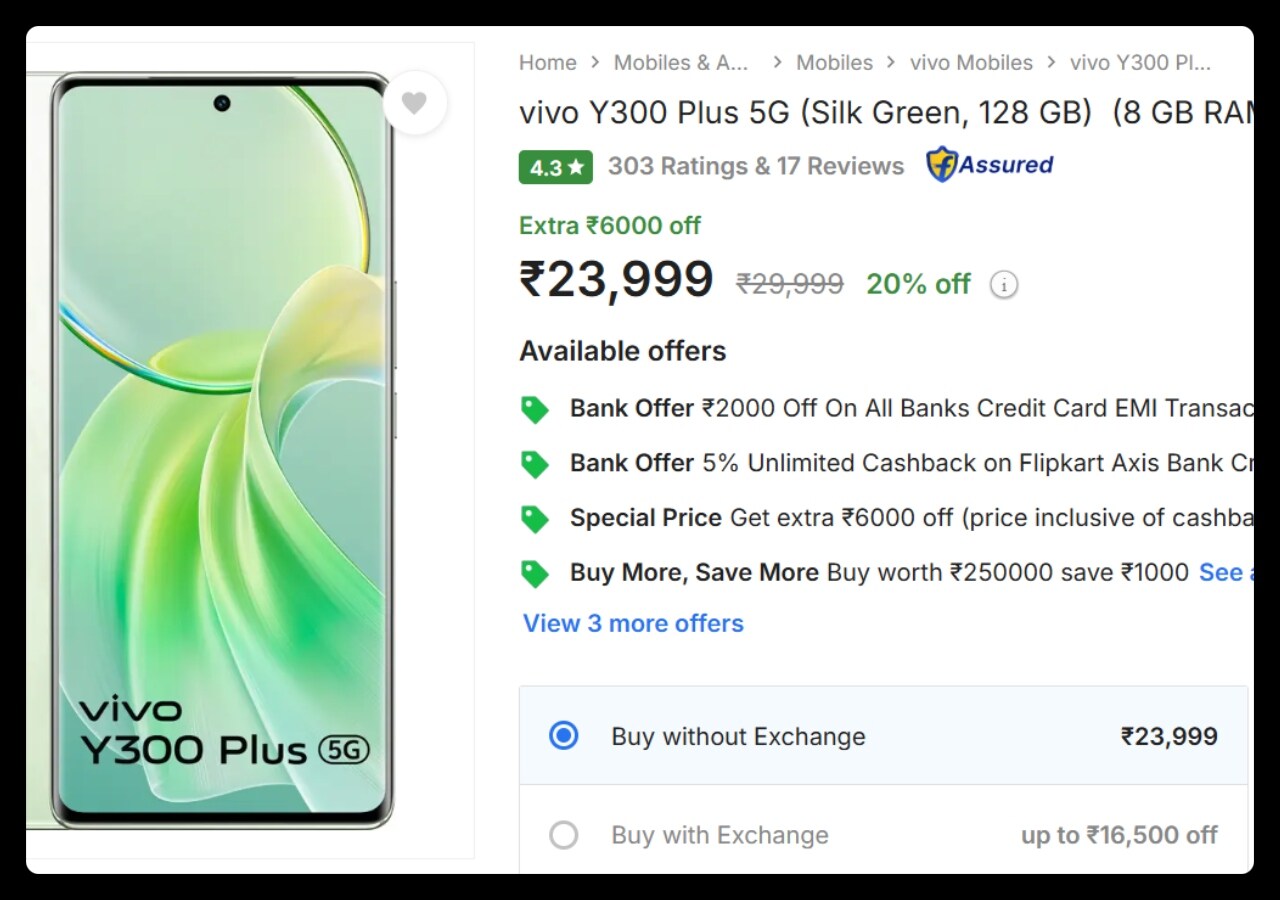 Vivo Y300 Plus 5G फोन के 8GB RAM और 128GB स्टोरेज वेरिएंट की कीमत Flipkart पर वैसे 29,999 रुपये लिस्ट है। हालांकि, सेल के दौरान इसे आप कम दाम में खरीद सकते हैं।
