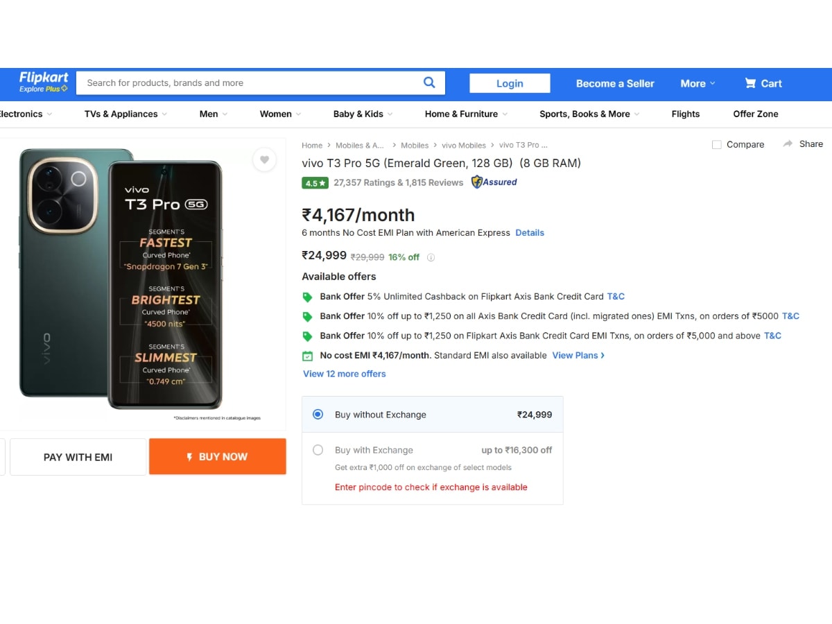 Vivo T3 Pro 5G फोन के 8GB RAM और 128GB स्टोरेज वेरिएंट को Flipkart से 24,999 रुपये में खरीदा जा सकता है। वैसे इसकी कीमत 29,999 रुपये लिस्ट है।