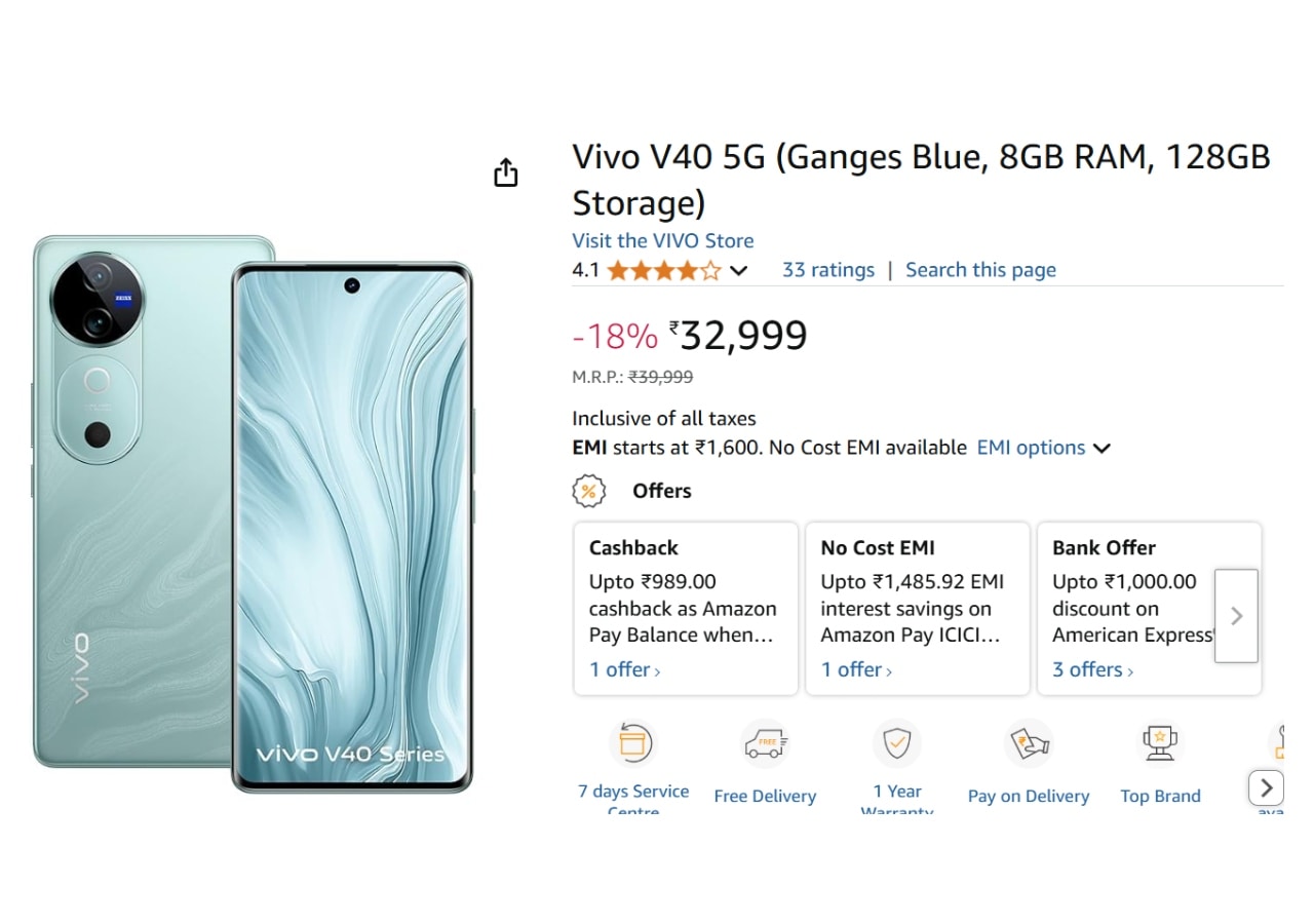 Vivo V40 5G फोन के 8GB RAM और 128GB स्टोरेज वेरिएंट की कीमत Amazon पर 39,999 रुपये लिस्ट है। हालांकि, इसे अभी आप सस्ते में भी खरीद सकते हैं।