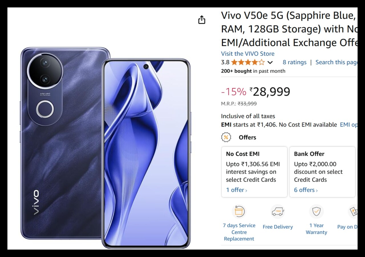 Vivo V50e 5G फोन के 8GB RAM और 128GB स्टोरेज वेरिएंट की कीमत Amazon पर 28,999 रुपये लिस्ट है। इस फोन पर इसके अलावा, बैंक कार्ड डिस्काउंट भी मिल रहा है।