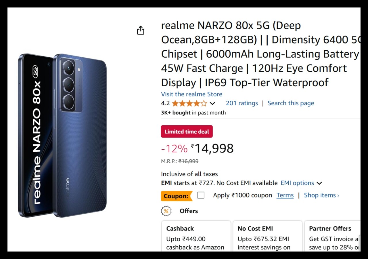 Realme NARZO 80x 5G फोन को Amazon से अभी 14998 रुपये में खरीद सकते हैं। साथ ही ई-कॉमर्स जाइंट फोन पर 1000 रुपये का डिस्काउंट कूपन दे रही है। ऐसे में इसे आप 13998 रुपये में खरीद सकेंगे।
