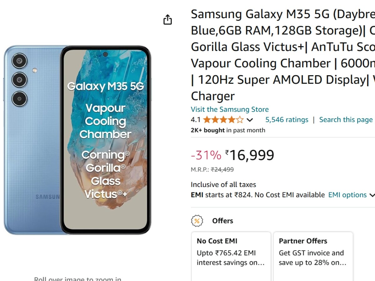 Samsung Galaxy M35 5G के डिस्काउंट ऑफर की बात करें, तो फोन को अभी Amazon से 16,999 रुपये में खरीदा जा सकता है। इतना ही नहीं इस फोन पर 824 रुपये की शुरुआती ईएमआई का भी ऑप्शन मौजूद है।