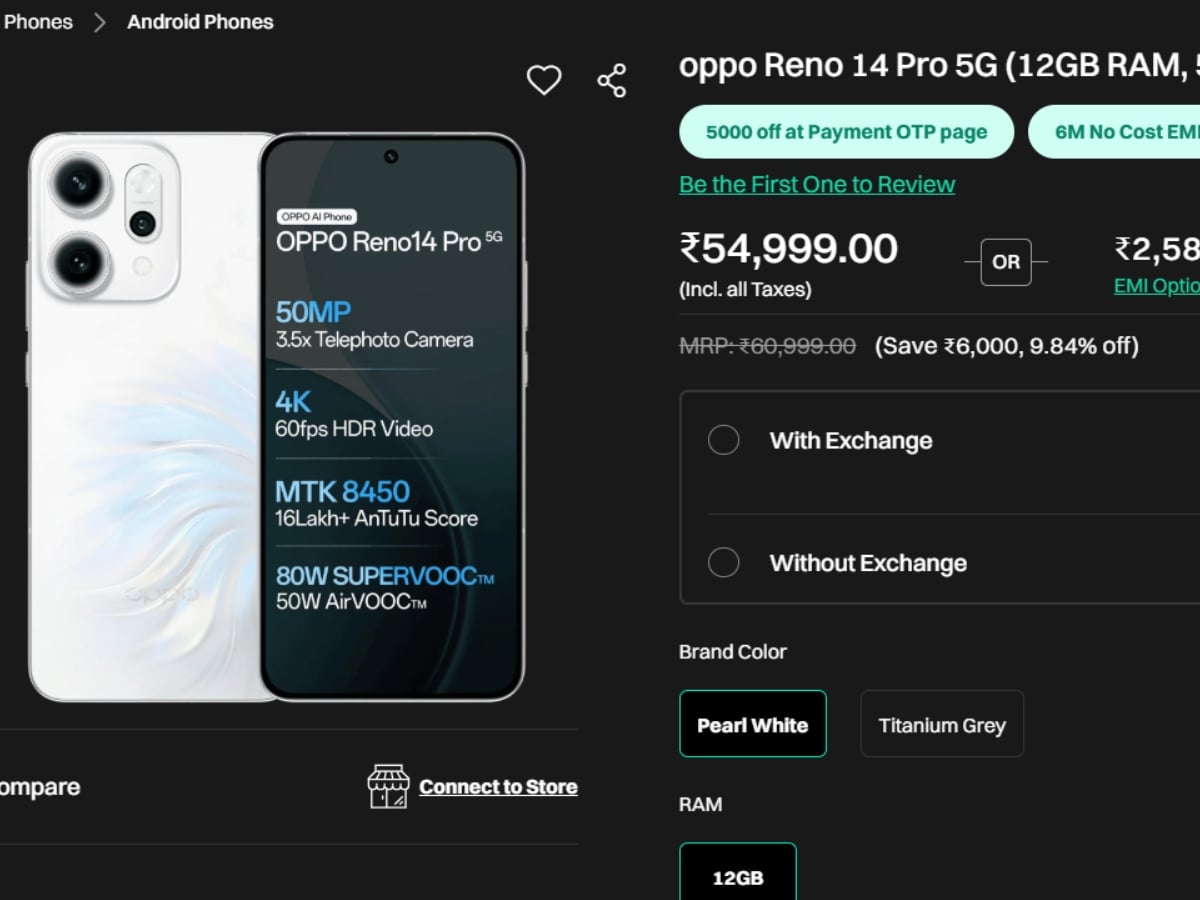 अगर आप Oppo Reno 14 Pro खरीदने का मन बना रहा हैं, तो आपको बता दें कि इस स्मार्टफोन के 12GB+256GB स्टोरेज मॉडल की कीमत 49,999 रुपये है। इसका 12GB+512GB स्टोरेज वेरिएंट 54,999 रुपये में मिल रहा है।