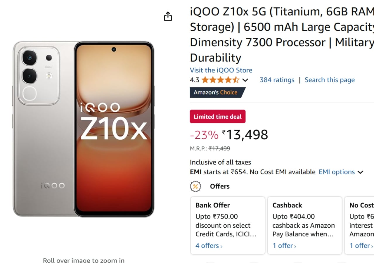 iQOO Z10x 5G फोन के 6GB RAM + 128GB स्टोरेज वेरिएंट की कीमत Amazon फर 17,499 रुपये लिस्ट है। हालांकि, अभी इस फोन को आप 13498 रुपये में खरीद सकते हैं।