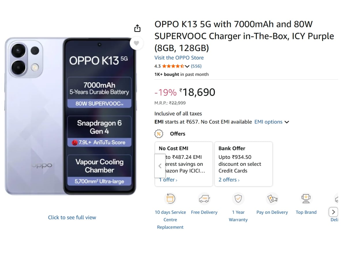 OPPO K13 5G के डिस्काउंट पर नजर डालें, तो अभी इस फोन को Amazon से 18,690 रुपये में खरीद सकते हैं। इस फोन पर 657 रुपये की EMI का ऑप्शन भी मिल रहा है।