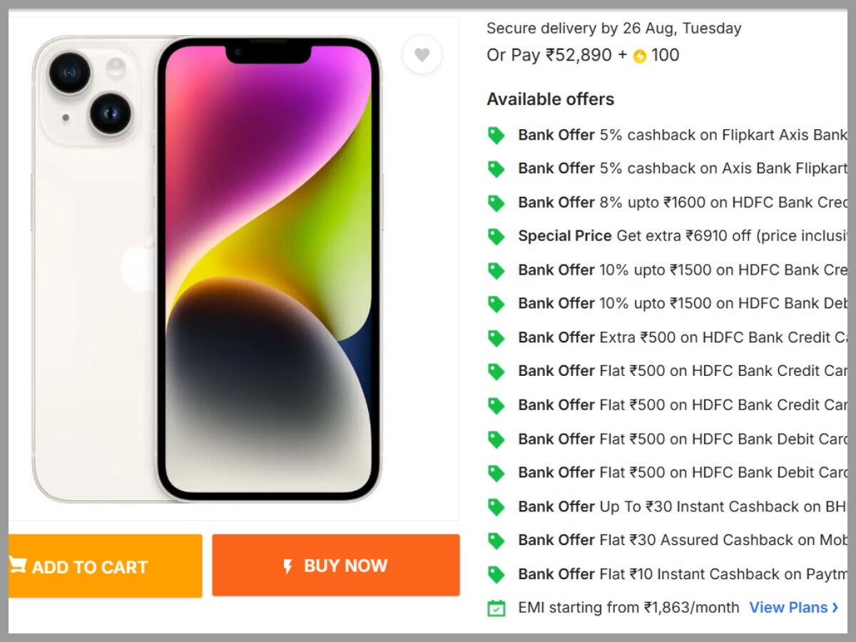अब ऑफर की बात करें, तो आईफोन 14 को HDFC बैंक के क्रेडिट कार्ड से खरीदने पर 1500 रुपये तक का डिस्काउंट मिल रहा है। इसके साथ 1,863 रुपये की शुरुआती EMI ऑप्शन भी मिल रहा है।