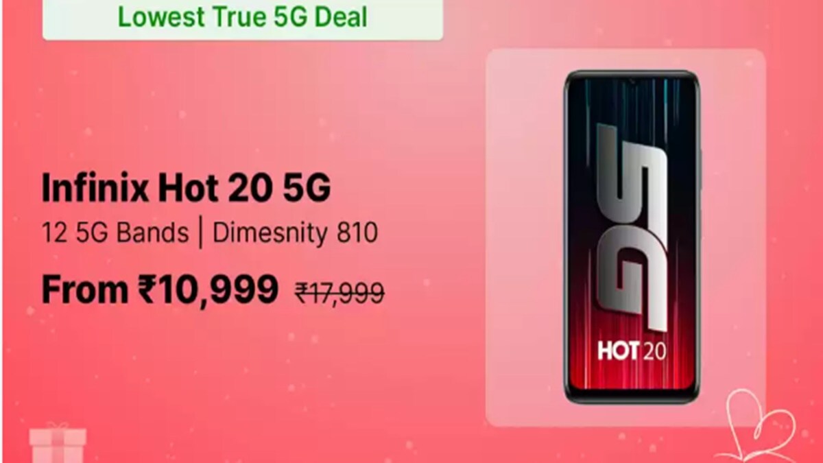 Infinix Hot 20 5G का यह मोबाइल 12999 रुपये में मौजूद है, लेकिन सेल के बैनर पर 10999 रुपये में खरीदा जा सकेगा। इस फोन में 6GB Ram, 128GB इंटरनल स्टोरेज मिलेगी। साथ ही इसमें बैक पैनल पर 50MP का कैमरा सेटअप है। यह मोबाइल 5000mAh की बैटरी दी जाएगी।