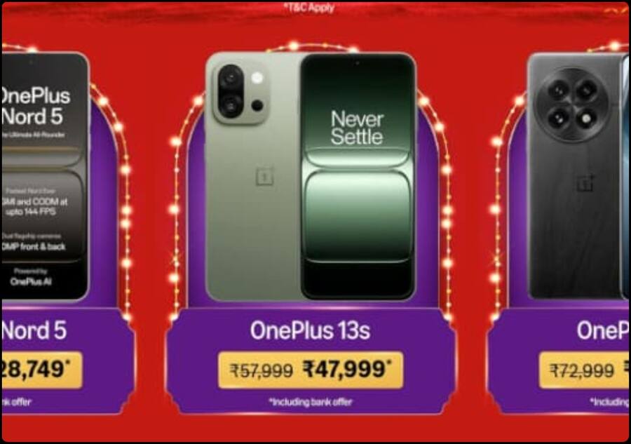Amazon Great Indian Festival Sale 2025 को डेडिकेटेड माइक्रोसाइट ई-कॉमर्स जाइंट पर लाइव हो गई है। उस साइट पर देखा जा सकता है कि 57,999 रुपये की कीमत वाले वनप्लस 13एस फोन को सेल के दौरन 47,999 रुपये में खरीदा जा सकेगा।