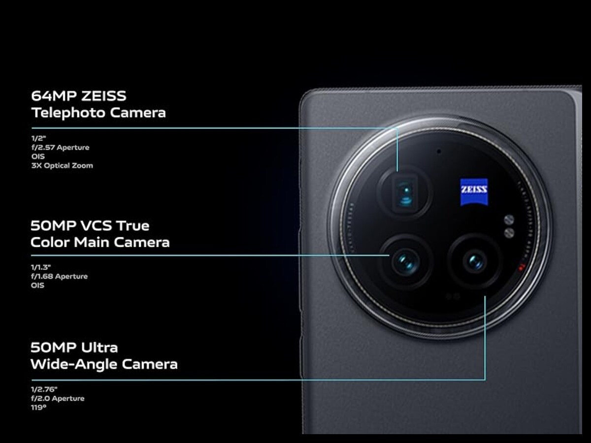 Vivo X Fold3 Pro 5G फोन में फोटोग्राफी के लिए ट्रिपल रियर कैमरा सेटअप दिया गया है। इसमें 50MP का प्राइमरी कैमरा OIS सपोर्ट के साथ आता है। इसके साथ 50MP का वाइंड एंगल लेंस और 64MP का टेलीफोटों सेंसर 3X जूम के साथ आता है।