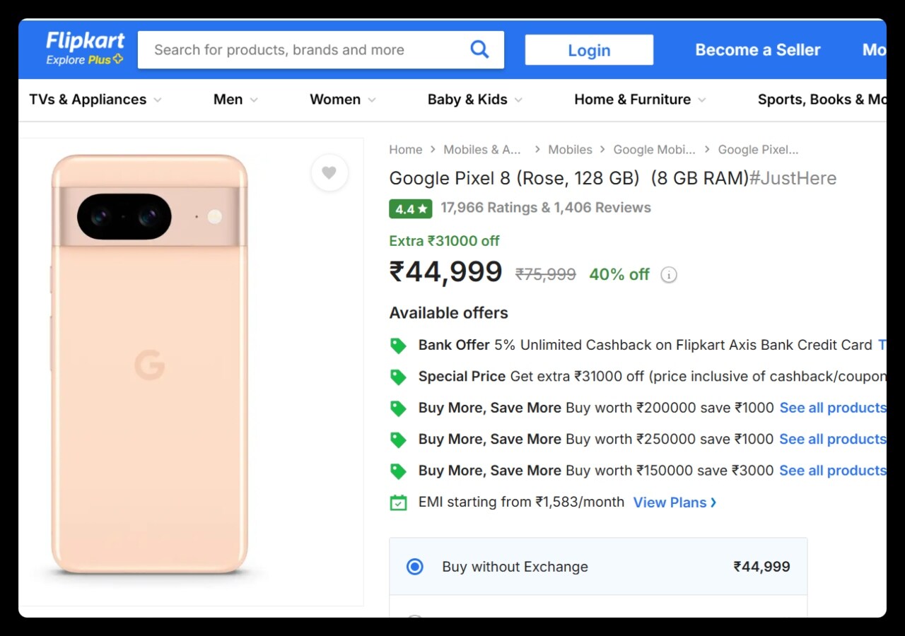 Google Pixel 8 फोन के 8GB RAM और 128GB स्टोरेज वेरिएंट की कीमत Flipkart पर 75,999 रुपये लिस्ट है। हालांकि, इसे आप अभी सस्ते में खरीद सकते हैं।