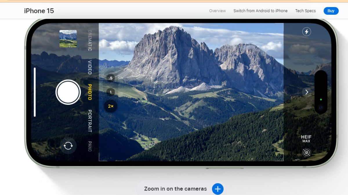 iPhone 15 में फोटोग्राफी के लिए डुअल रियर कैमरा सेटअप दिया गया है, जिसमें 48MP का प्राइमरी कैमरा और 12MP का सेकेंडरी कैमरा शामिल है।